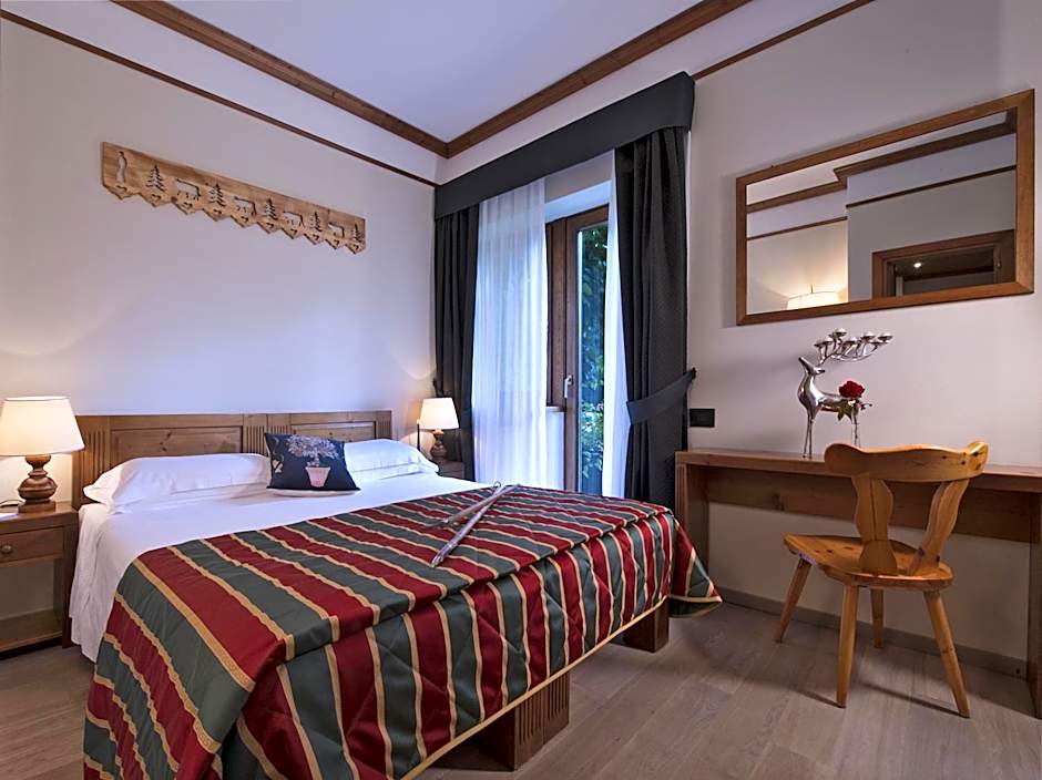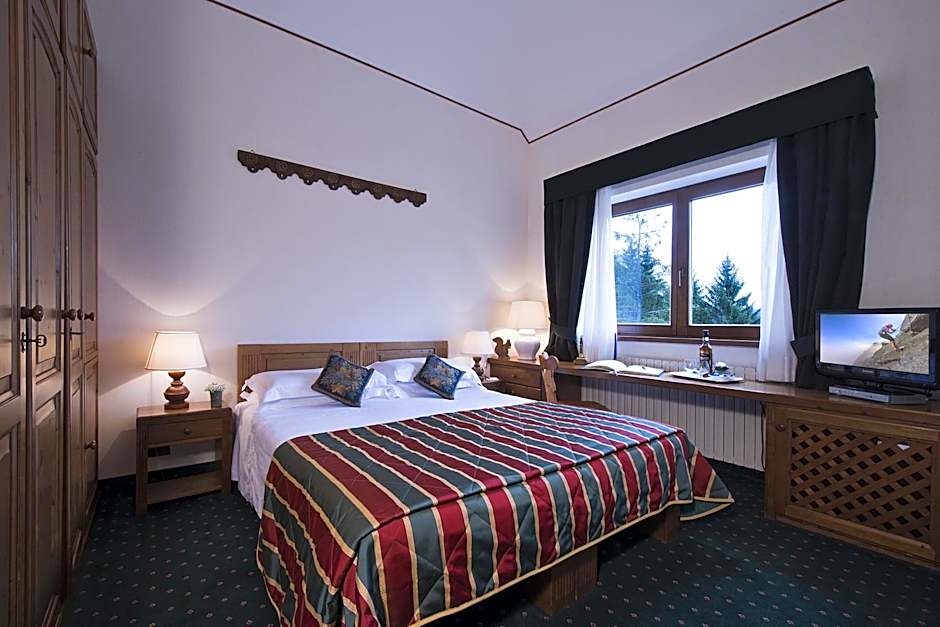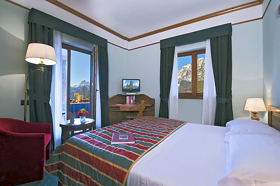 Offering a terrace with mountain views, This room with attached bathroom features a satellite flat-screen TV, carpeted floors and wooden furniture.